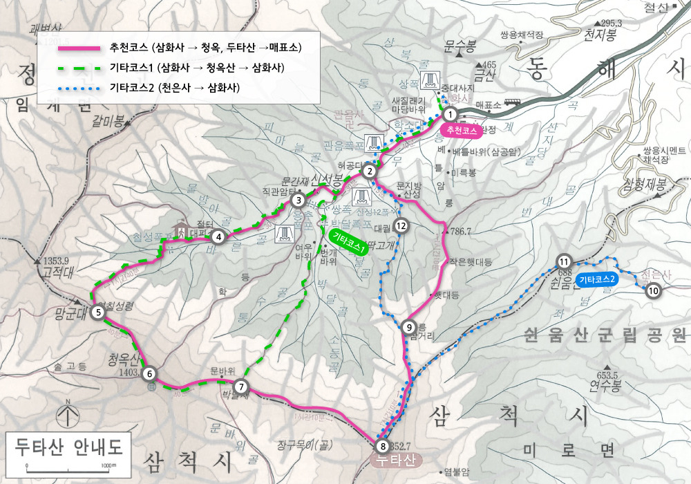 3가지 등산코스와 아래 등산코스 지도를 비교해 보시면서, 두타산 등산 계획을 세워보세요.