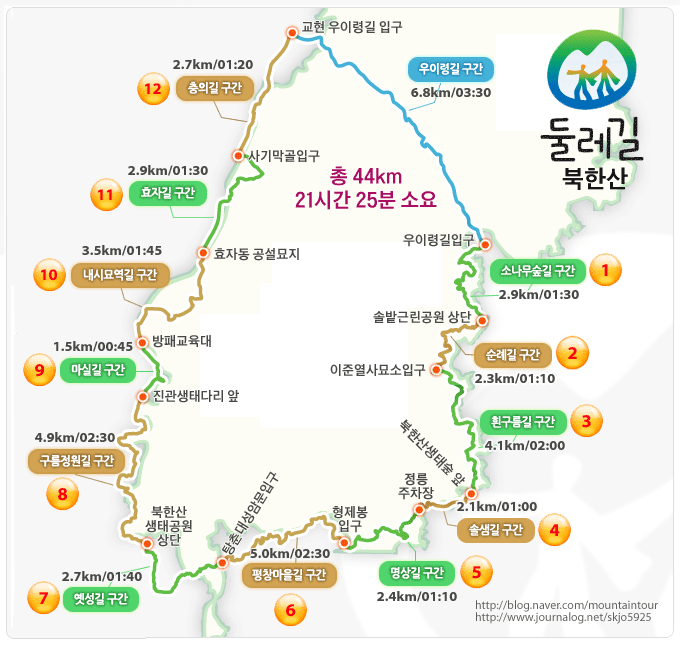 북한산 둘레길은 총 21개 코스로 구성되어 있으며, 난이도와 특징이 다 다릅니다. 그중 가장 인기 있는 코스를 소개해 드릴게요!