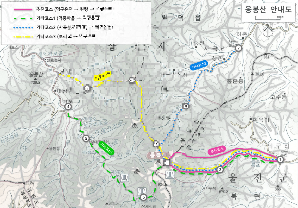 ✔️ 사곡분교(폐교) ⑦ → 재량박골 ⑧ → (응봉지 남릉) → (응봉산 서북릉) → 정상 ③ → 덕구온천 ①